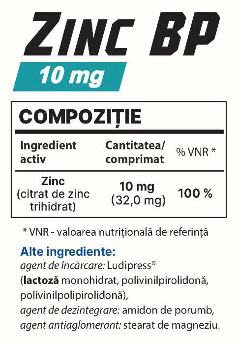 Цинк BP 10 мг – 40 Таблетки е хранителна добавка на Balkan Pharmaceuticals, която предоставя дневна доза елементен цинк под формата на цинков цитрат трихидрат. Продуктът е разработен с внимание към качеството и надеждността, за да осигури сигурен и удобен начин за допълване на дневния режим.